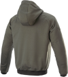 Anatomically profiled design for an optimized performance fit, Knitted fabric main shell for a casual aesthetic, Interior reinforcement on shoulder and sleeves for enhanced levels of abrasion resistance, Nucleon protectors on the shoulders and elbows for effective protection against impacts, Pouch pocket on front for comfort, Hidden zippered hand pocket on right side to secure belongings while riding, Fixed hood with jersey material lining for enhanced comfort off the bike