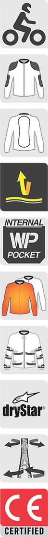 This suit is built to accept the Tech-Air? Street Airbag System, The vest, purchased separately, installs easily and does not require any external sensors to operate, Should it detect a crash, it will deploy a protective airbag, providing unrivaled protection to the rider's full back, shoulders, kidney area and chest, The garment is designed with stretch gussets on the arm and sleeves to accommodate the jacket*s inflated volume without compromising seam strength or material integrity, The jacket*s ergonomic design means that it can be worn without the airbag system for a versatile, personalized fit, LED display on sleeve indicating airbag*s operational status, while internal housing located in the built-in back protector accommodates the system vest*s ECU, Internal hook and loop grip closure fixings plus cable housing seamlessly accommodate the airbag system, Reflective graphic details and logos allow the ride to be more visible to other roads users in varying light conditions, Front waterproof cargo pockets offer greater convenience and a secure closure, Large, external utility pocket on lower back plus waterproof internal pockets and insert wallet pocket, Integrated soft edge collar and 3D mesh construction for enhanced comfort over long distances, Premium YKK zipper with double sliders for main front closure offer adaptable and secure convenience, Removable long-sleeve thermal liner ensures comfort on hot or cold days, Extra protective polymer layer in critical elbow and lower arm areas for superior abrasion resistance, Advanced reinforced poly-fabric textile and Alpinestars exclusive Drystar? waterproof and breathable construction for excellent all-weather performance, Internal impact protection provided by removable elbow and shoulder protectors, Chest and back pad compartments (Nucleon chest and back protector inserts available as accessory, sold separately) for use when Tech-Air Tech-Air? is not installed, Zippered chest air intakes and back exhaust ports for internal climate control and enhanced riding comfort, Pre-contoured sleeves with accordion stretch panels on elbows for improved riding performance, plus volume adjustment to ensure close fit, Hook-and-loop grip waist adjustment belt for highly customizable fit, External zippered pockets for safe and secure storage, Optimized for use with Alpinestars textile pants with internal waist connection zipper