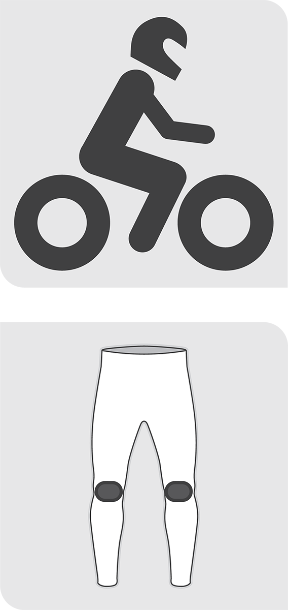 Stretch fabric shell construction, Stretch accordion panels on knee area to increase comfort in riding position, Reflective prints on inner side of lower edge, Full aramidic fiber lining, Replaceable foam hip pad inserts for comfort; sold separately